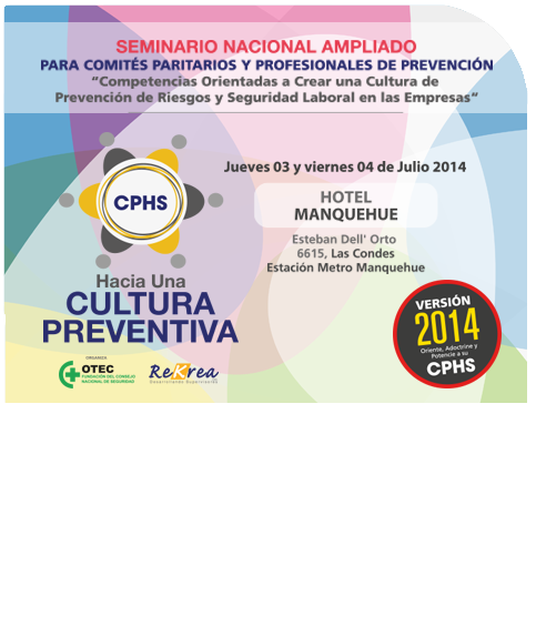 Por segundo año consecutivo se llevará a efecto, durante los días 3 y 4 de julio 2014, el Seminario Nacional Ampliado para Comités Paritarios de Higiene y Seguridad y Profesionales de Prevención. El evento, de gran acogida en su primera versión 2013, tendrá lugar en el Hotel Manquehue, situado en calle Esteban Dell´Orto 6515, (Estación Metro Manquehue) Las Condes, Santiago.